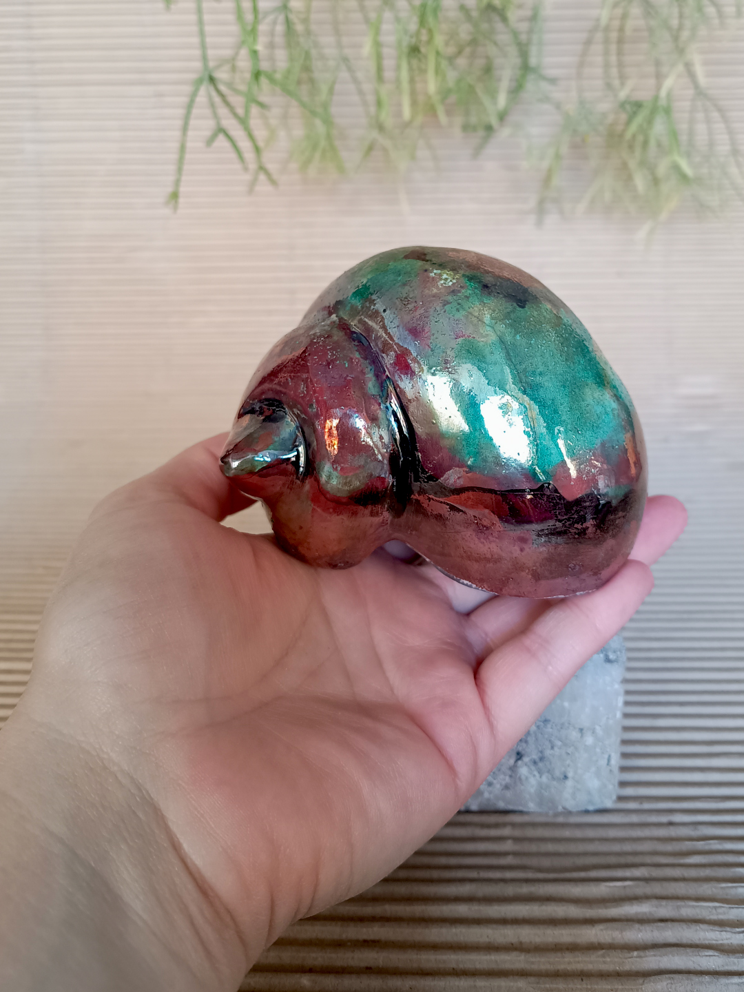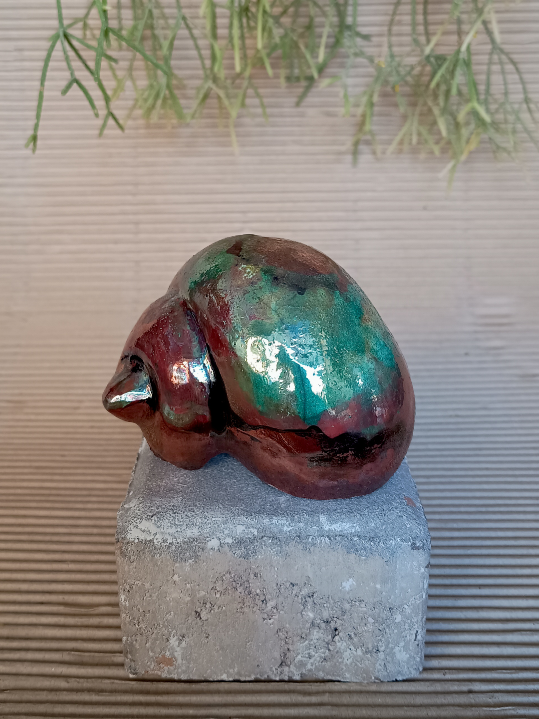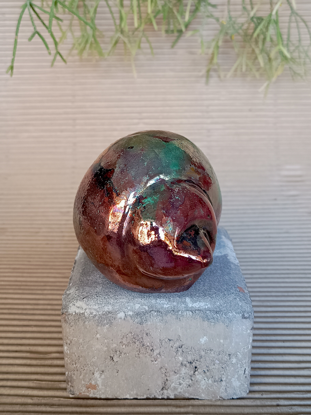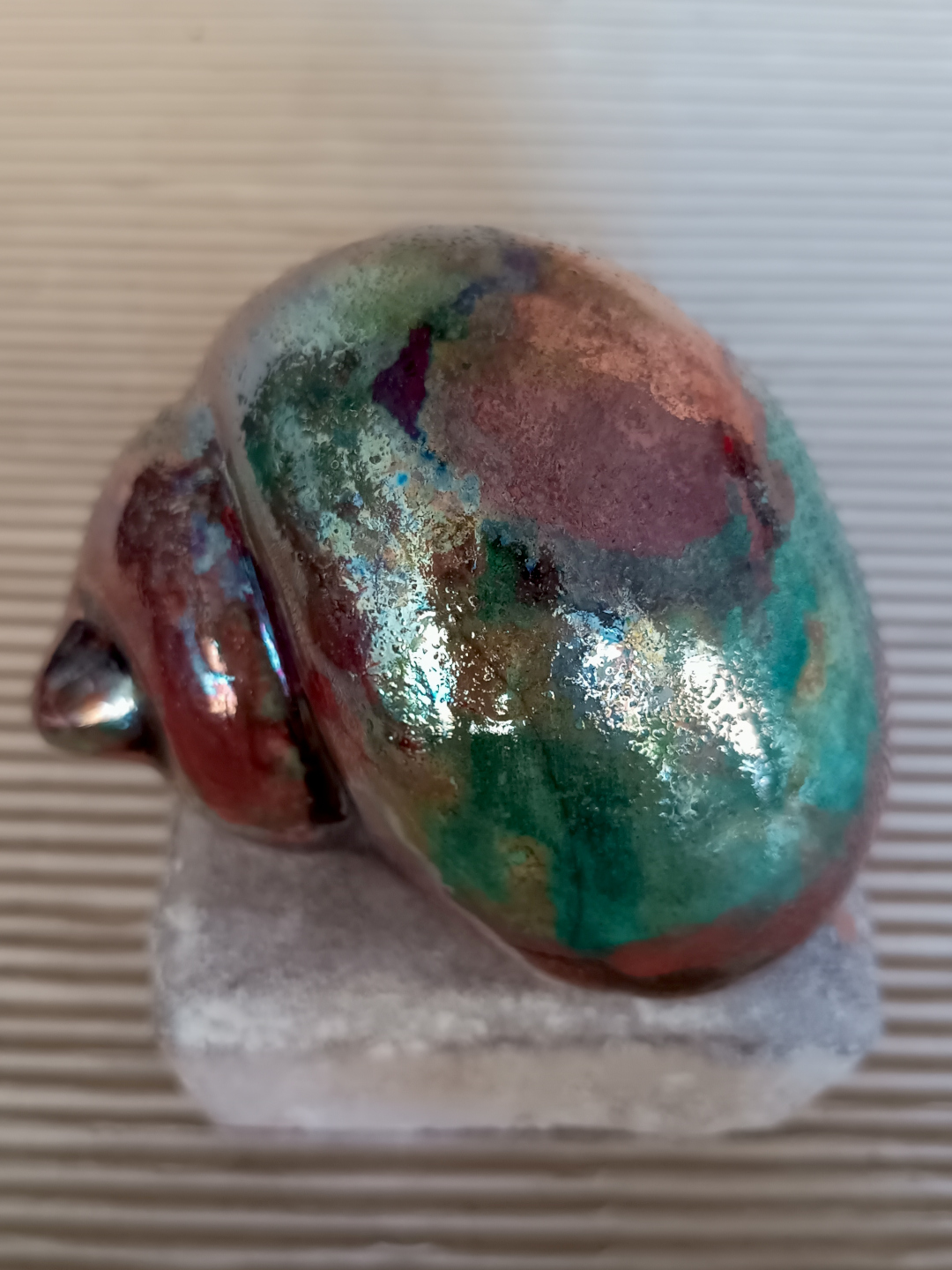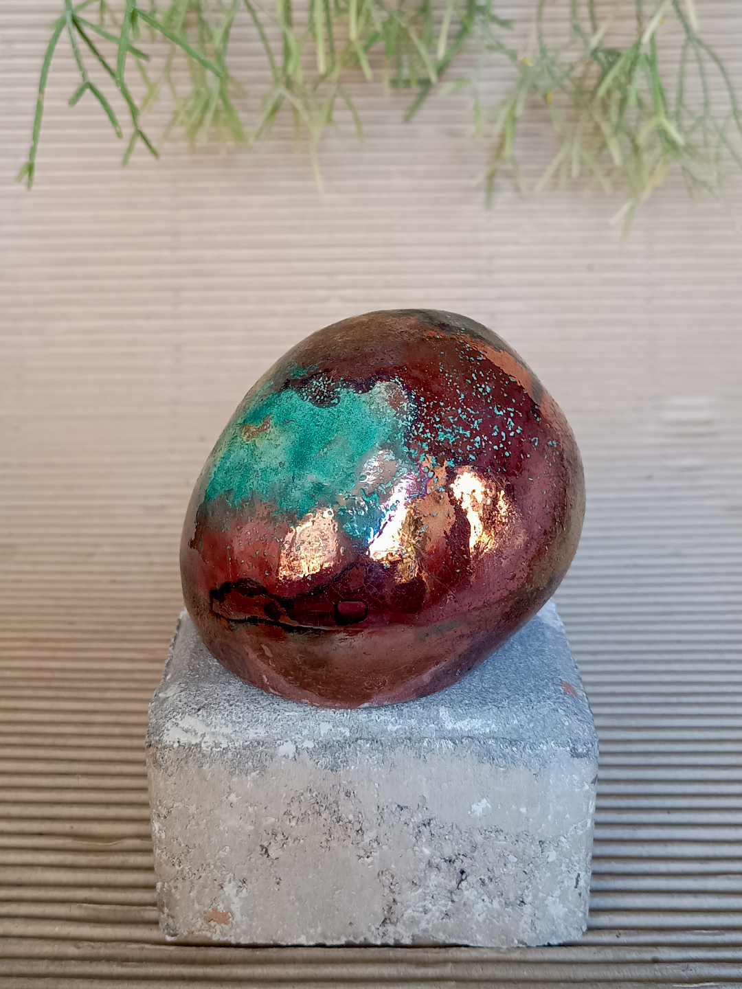 Pieza realizada a mano en arcilla blanca refractaria, 1270ºC. Decorada en cocción especial de rakú