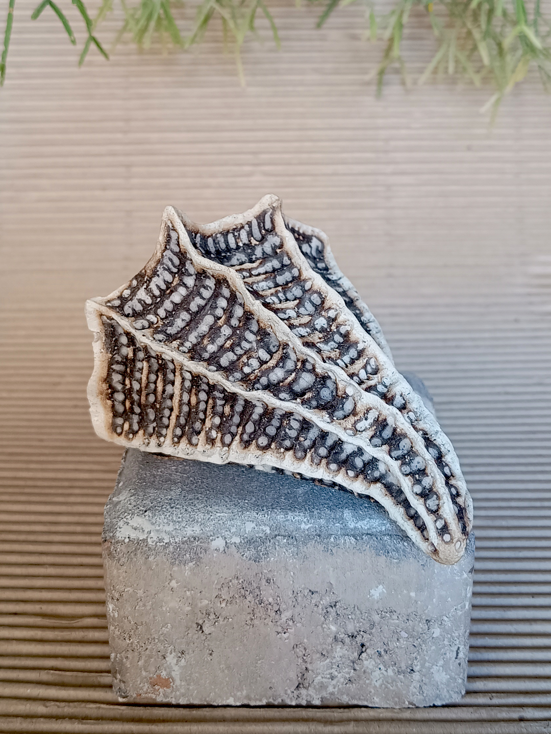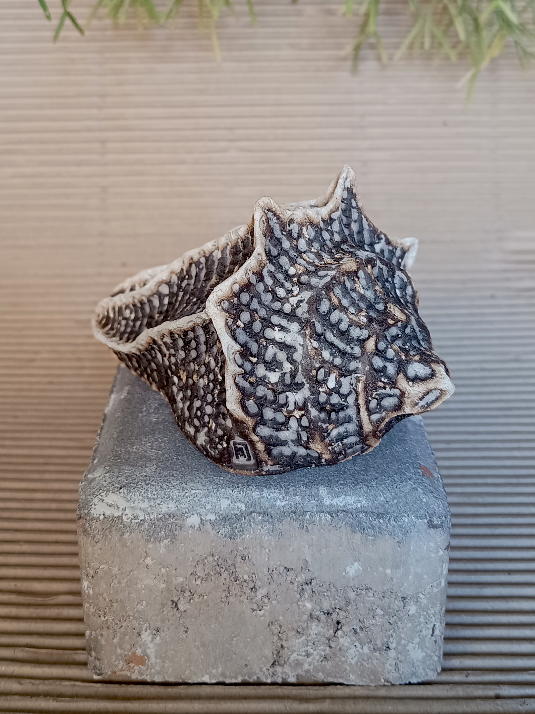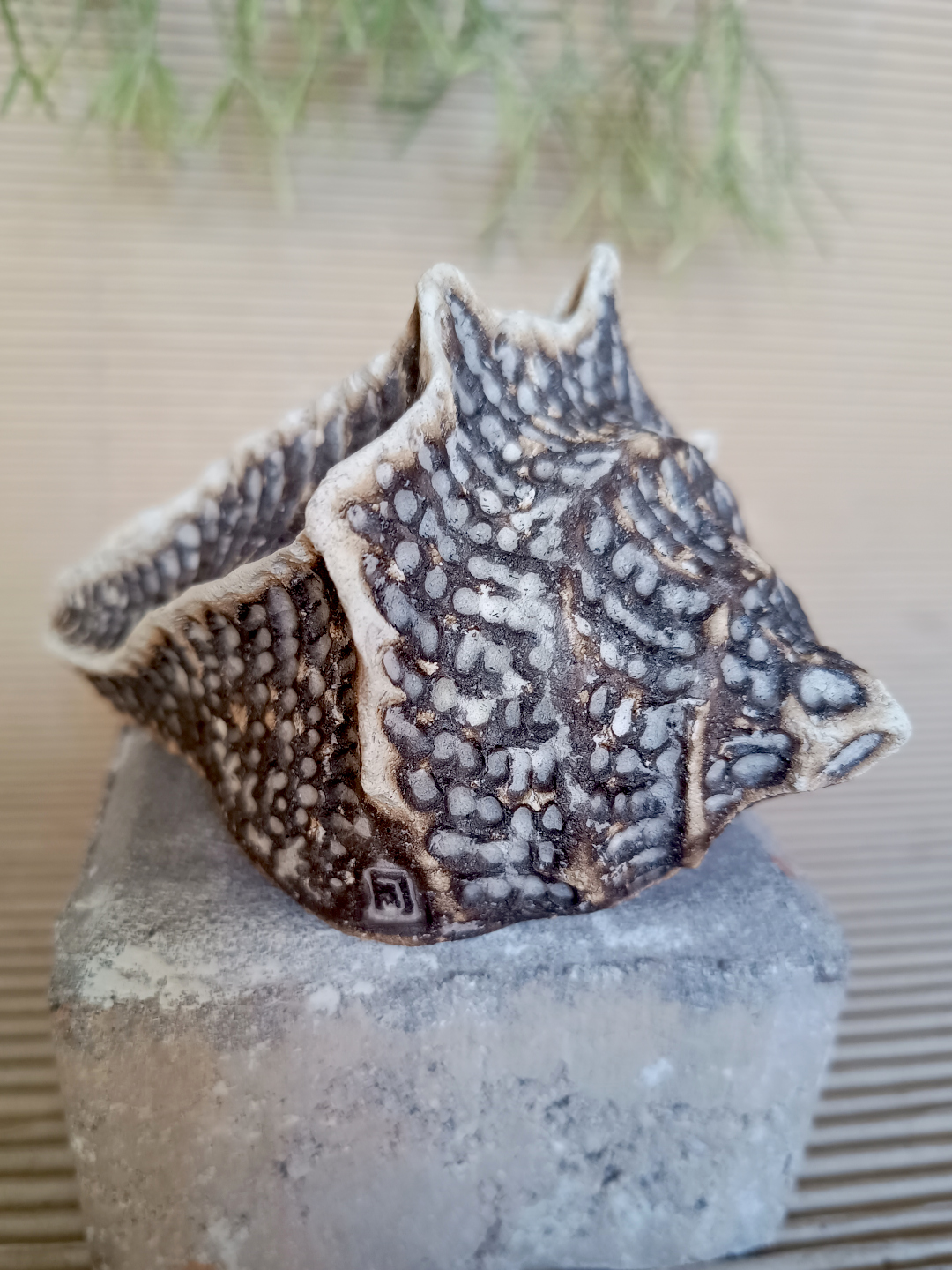 Pieza realizada a mano en arcilla blanca refractaria, 1270ºC. Decorada en cocción especial de rakú