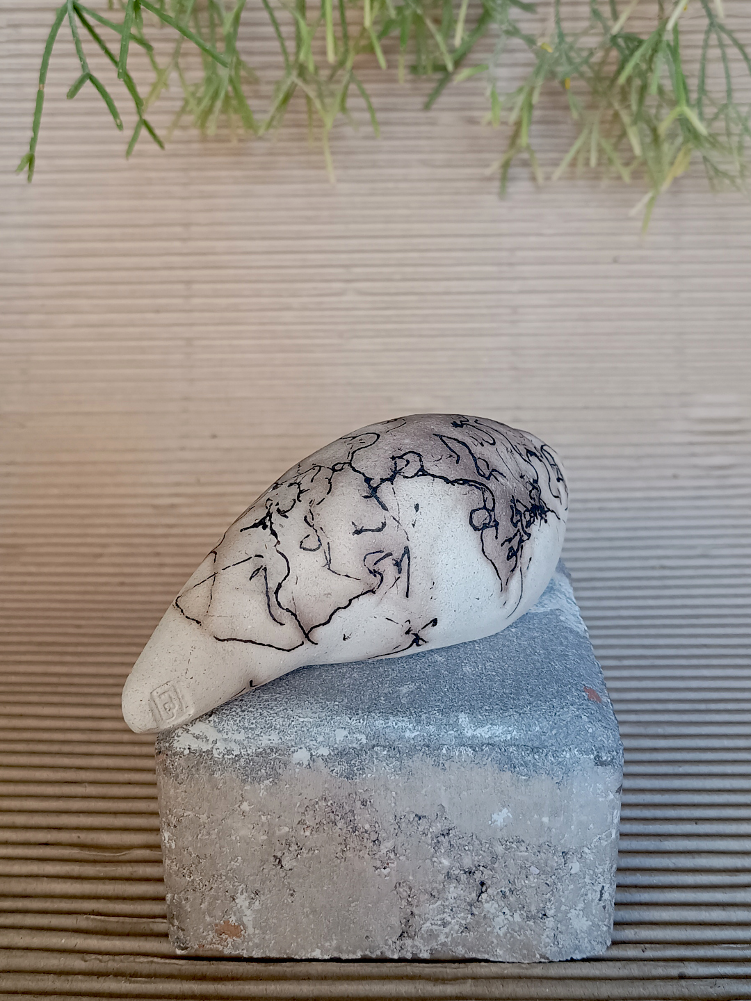 Pieza realizada a mano en arcilla blanca refractaria, 1270ºC. Decorada en cocción especial de rakú