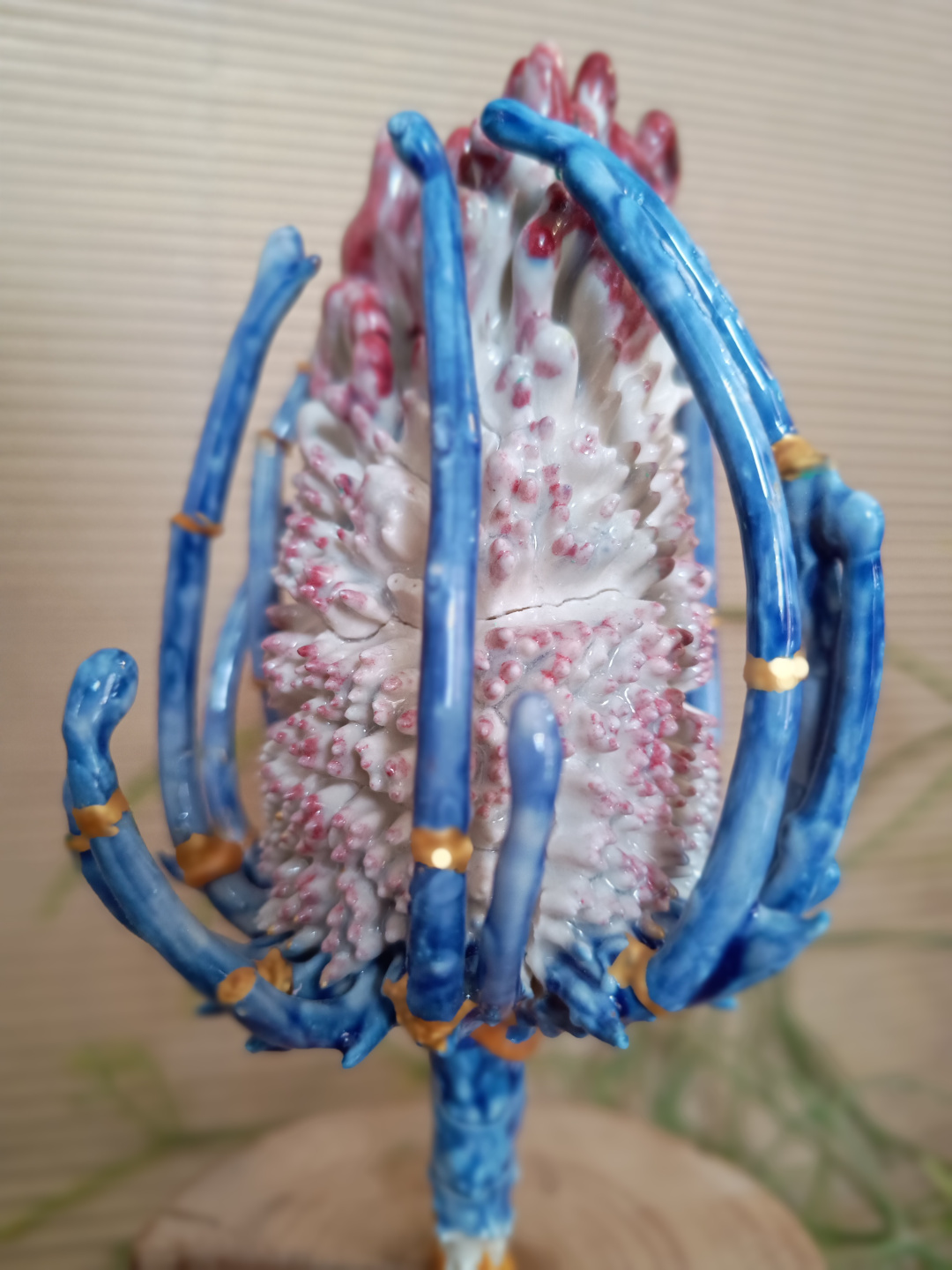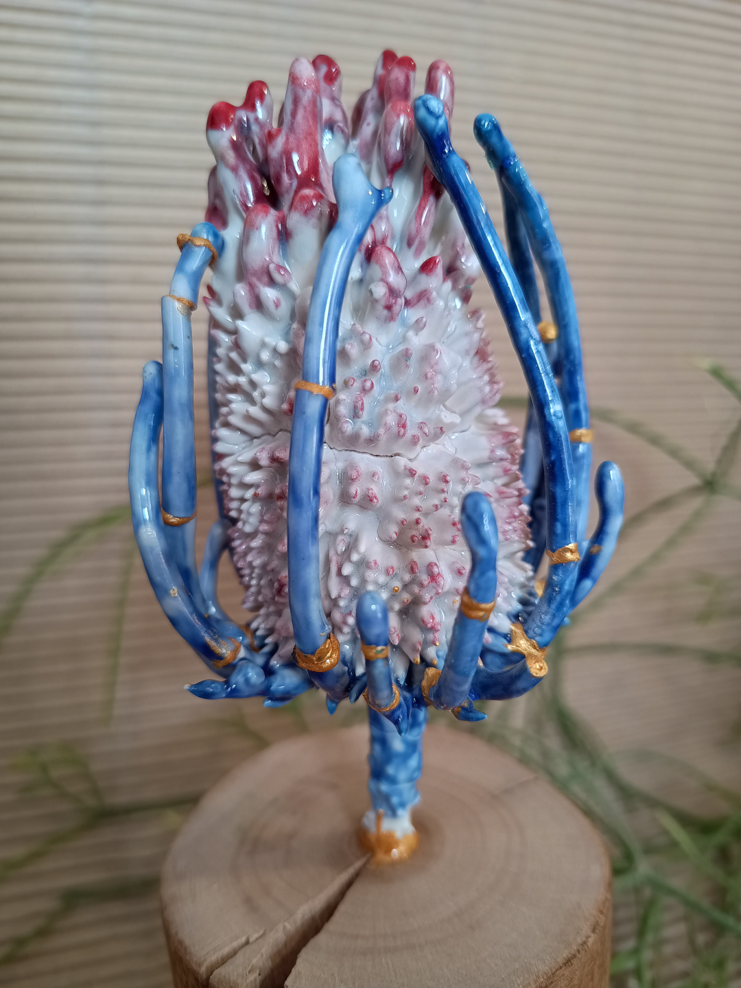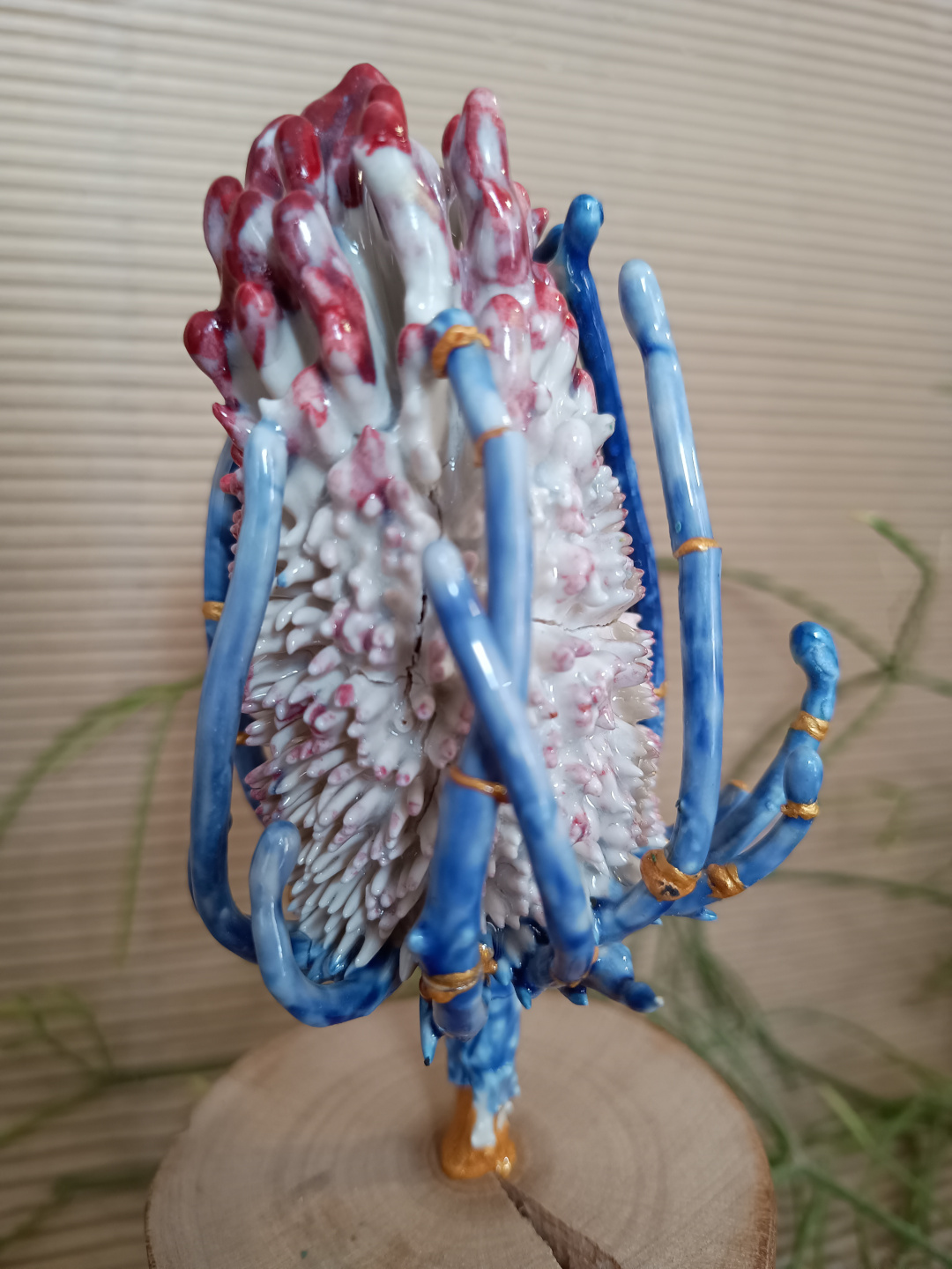 Pieza realizada a mano en gres, 1270°C. Decorada con engobes. Esmaltada