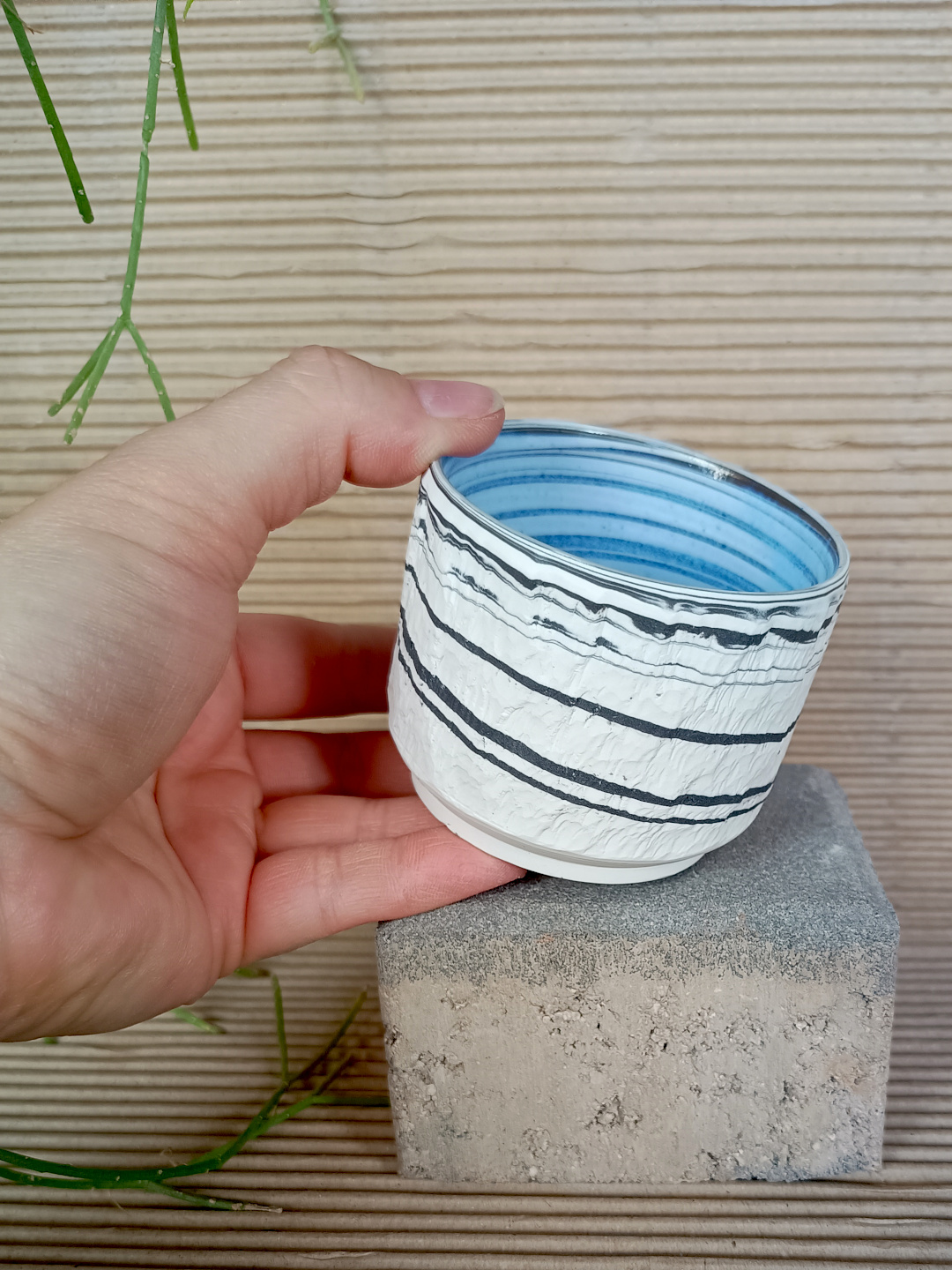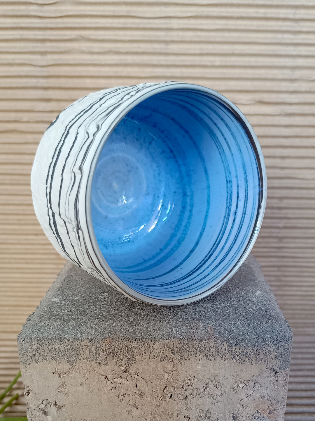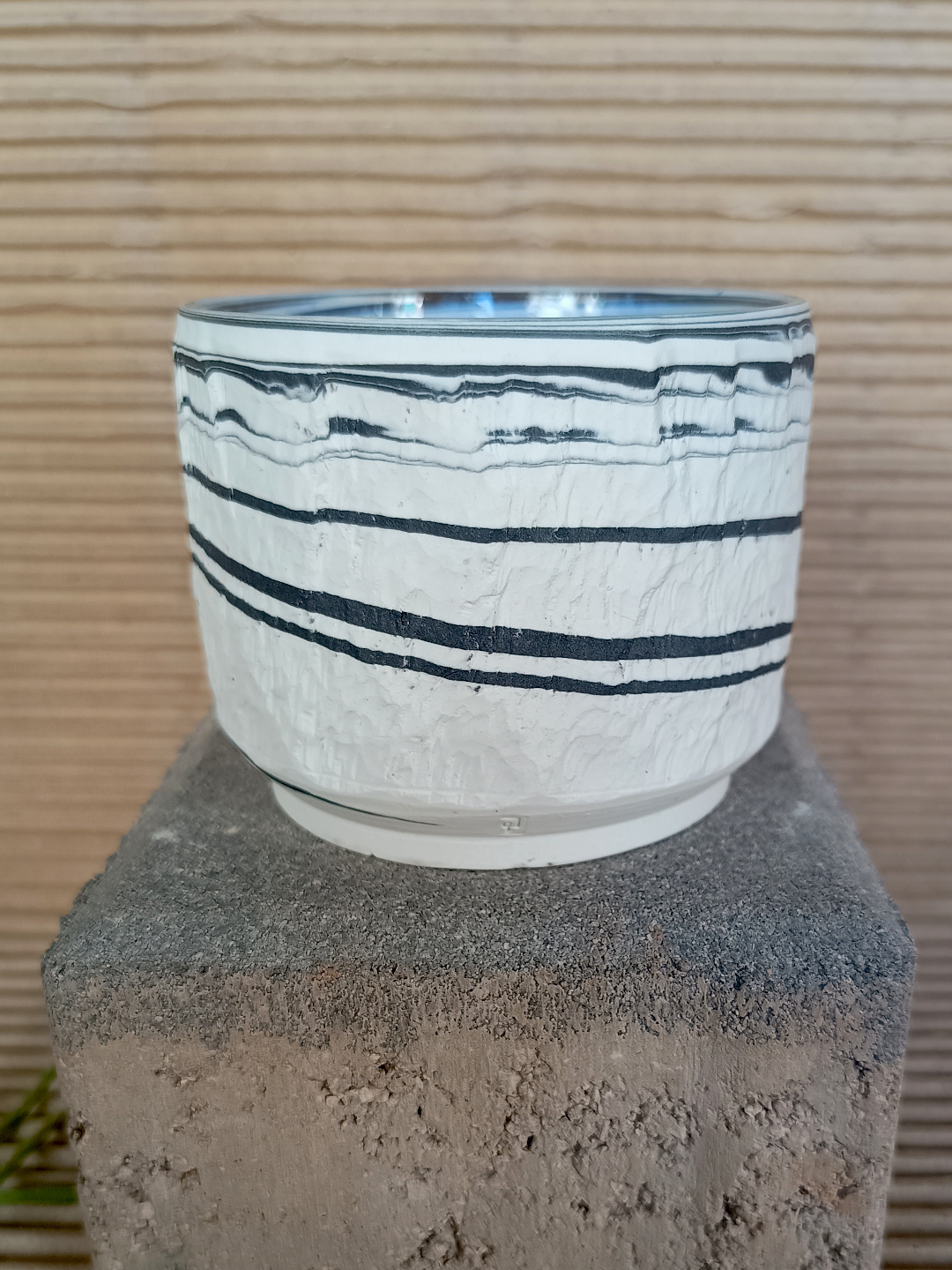 Pieza realizada en torno en porcelana blanca y negra con la técnica neriage, 1270ºC. Interior esmaltado. Exterior trabajado con textura. Biscuit