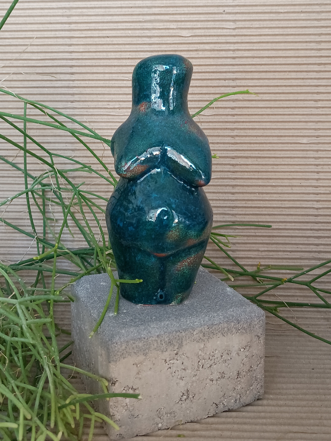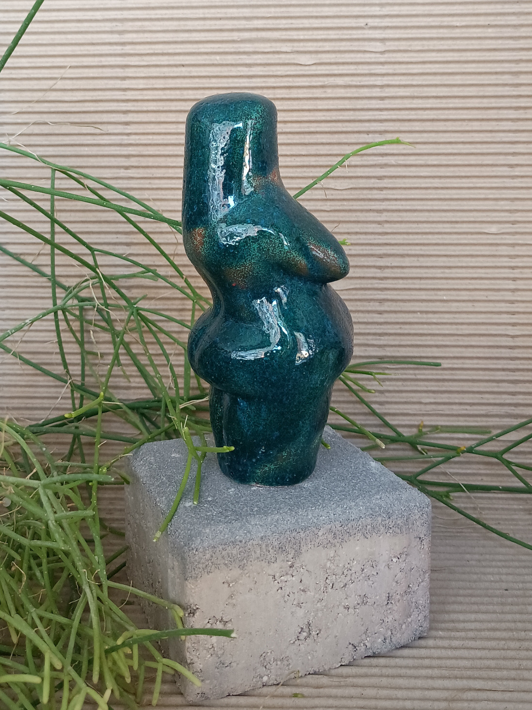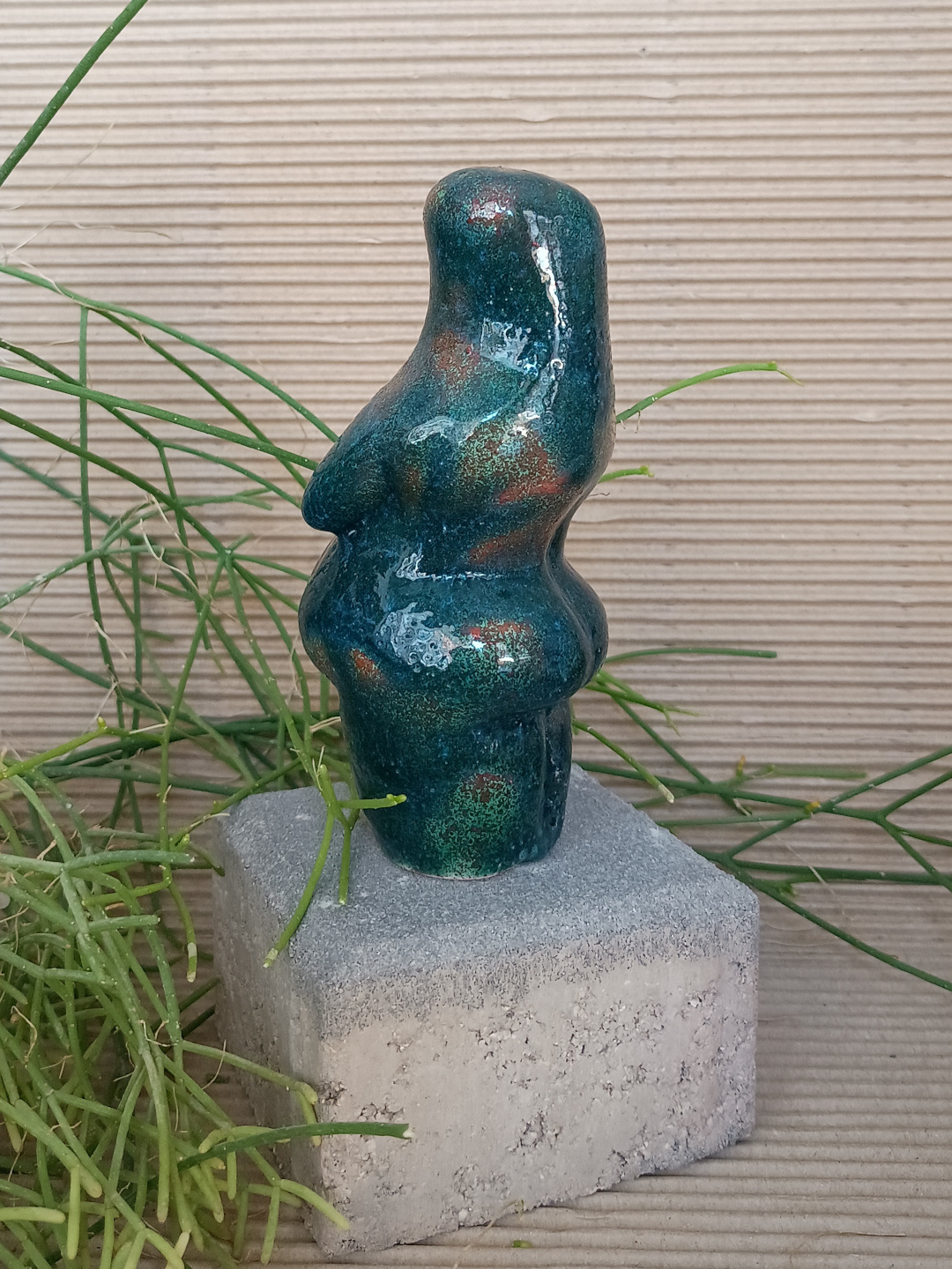 Pieza realizada con molde en loza blanca, 1050°C. Decorada con esmalte de cobre