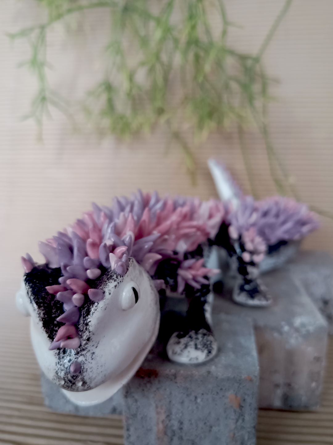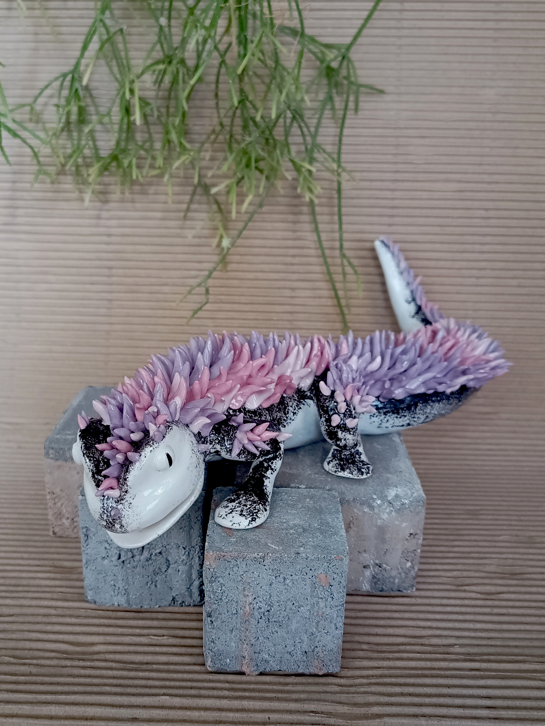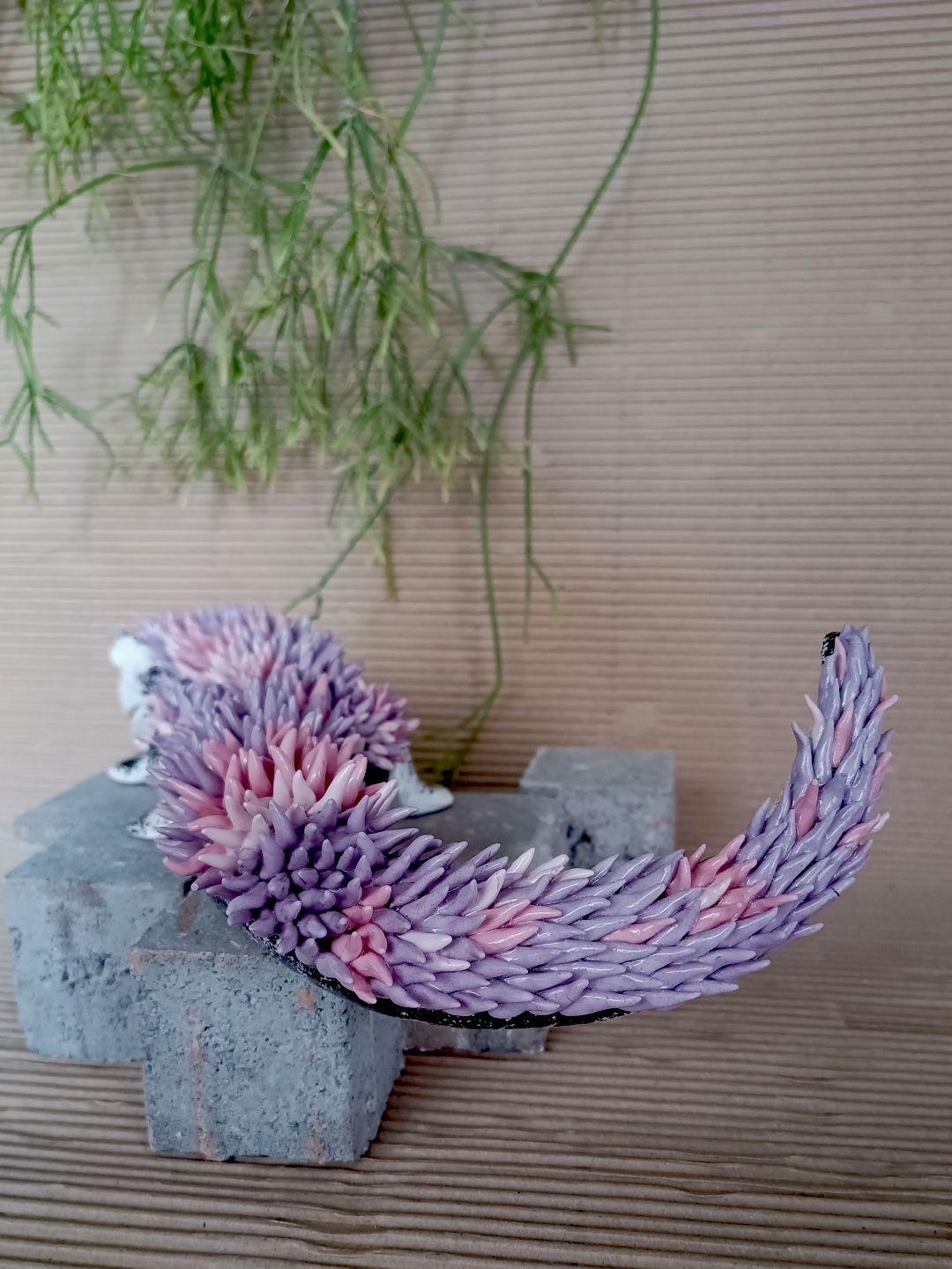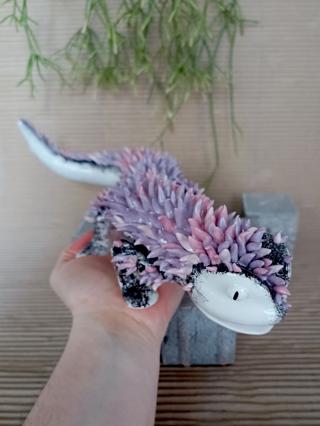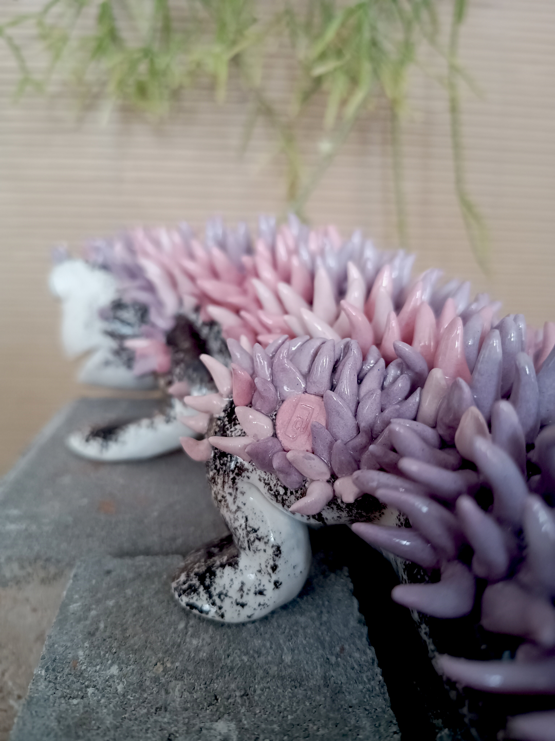 Escultura maciza realizada completamente a mano en loza, 1050ºC. Decorada con texturas cerámicas coloreadas y esmalte.