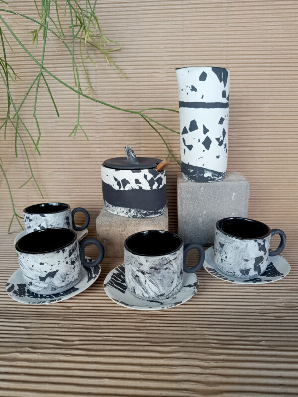 Piezas realizadas a mano en porcelana blanca y negra, 1270ºC. Esmaltadas en el interior. Aptas para uso alimenticio, horno, microondas y lavavajillas