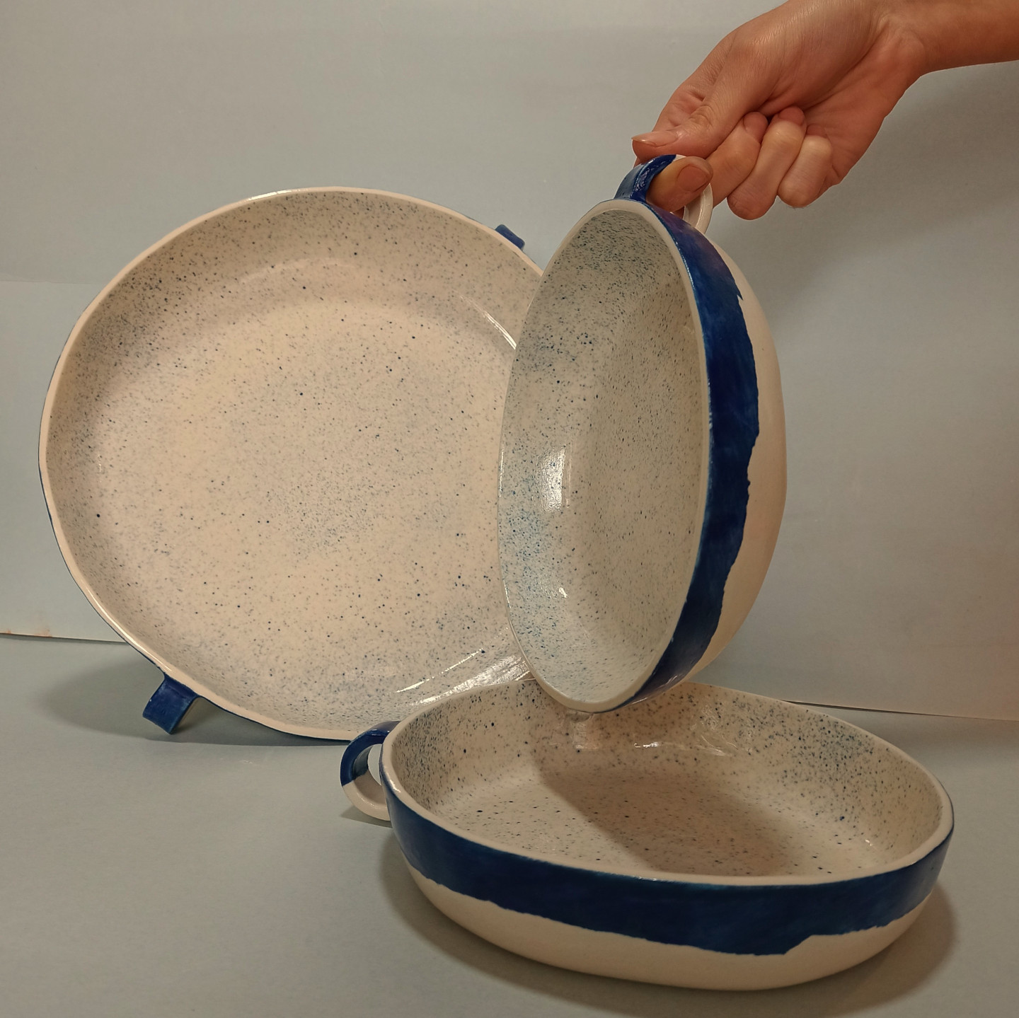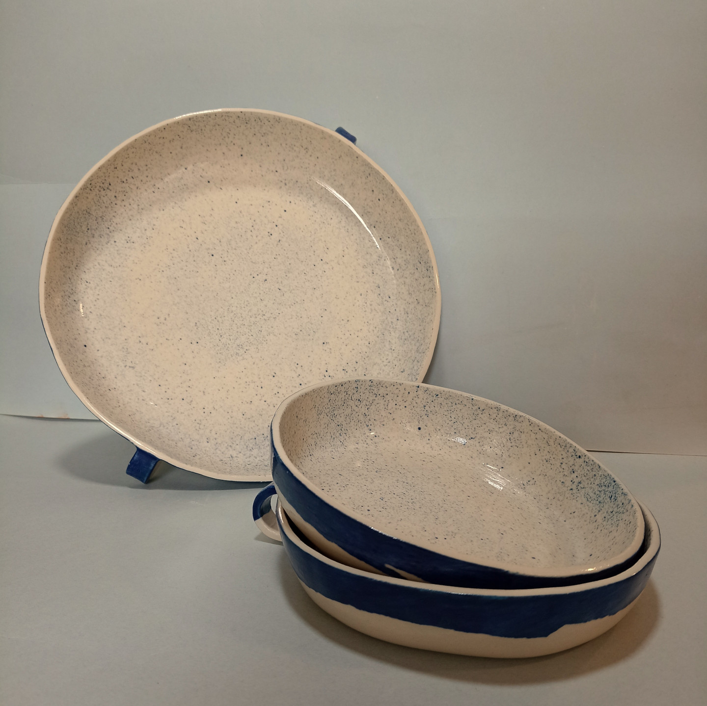 Piezas realizadas a mano en gres, 1270°C. Decoradas con engobes y esmaltada. Aptas para uso alimenticio, horno microondas y lavavajillas