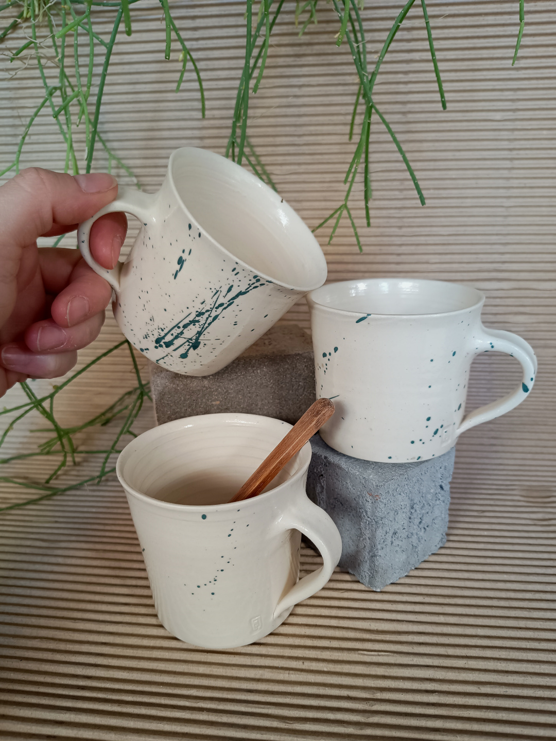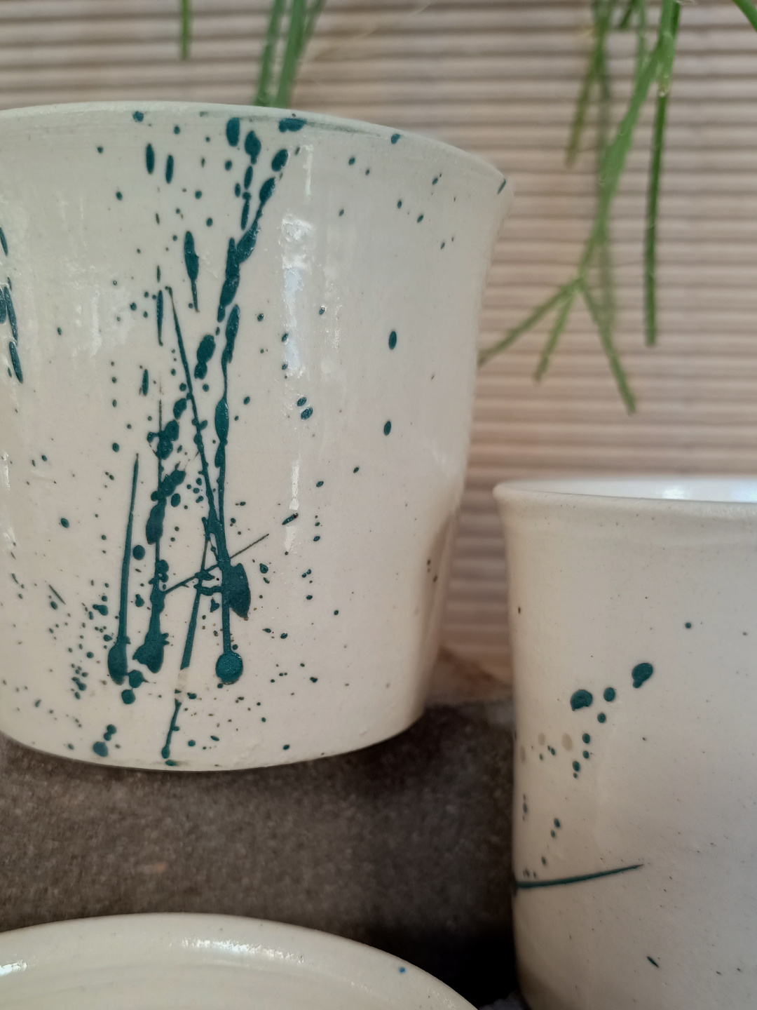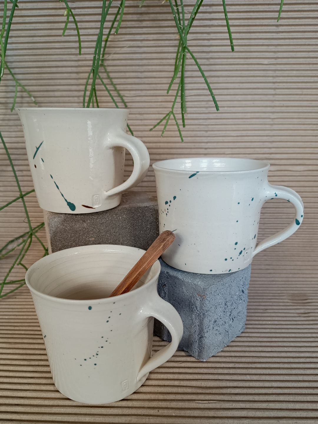 Conjunto de tres piezas, realizadas en torno en gres, 1270°C. Decoradas con engobes y esmaltadas. Aptas para uso alimenticio, horno microondas y lavavajillas