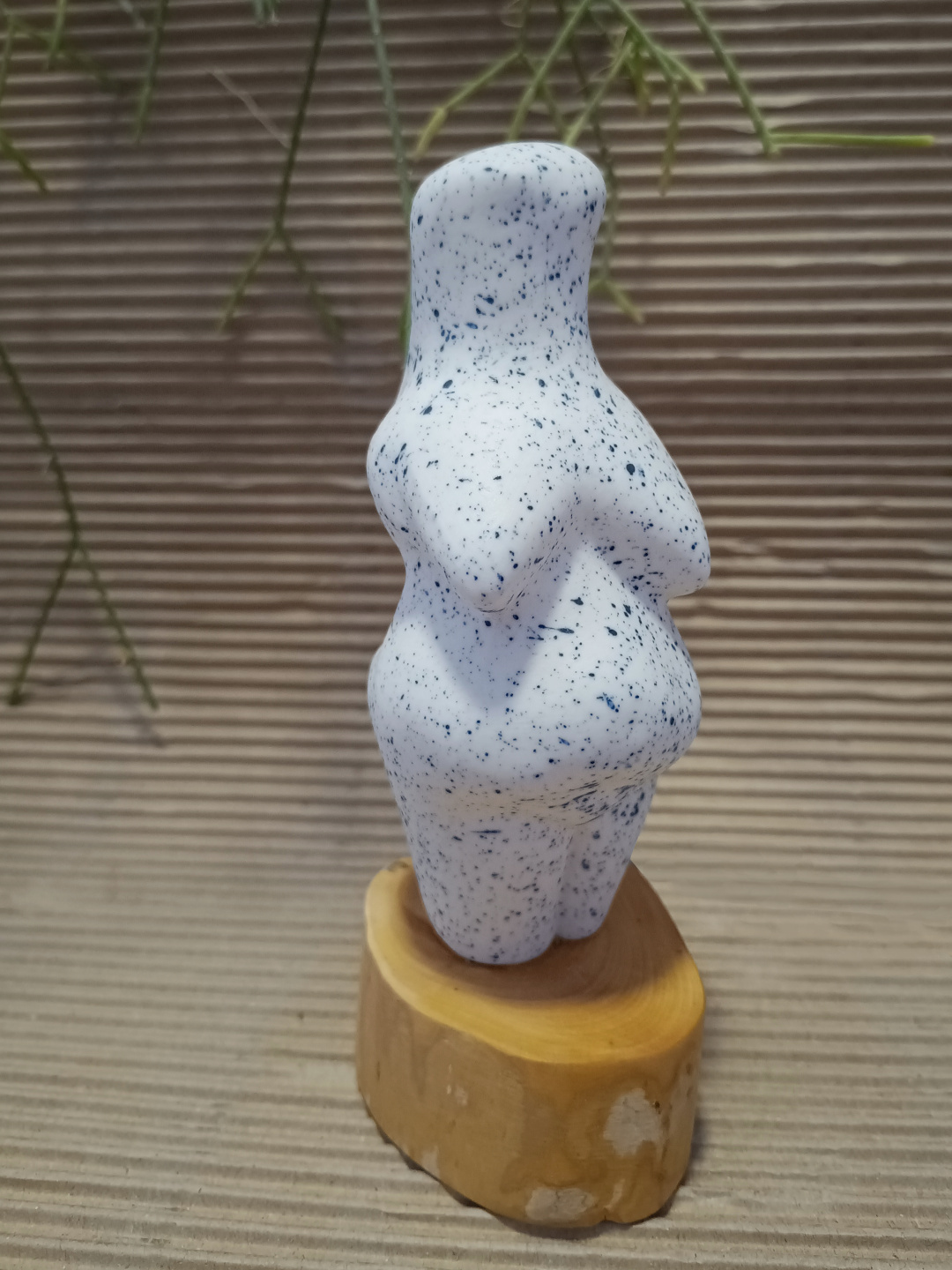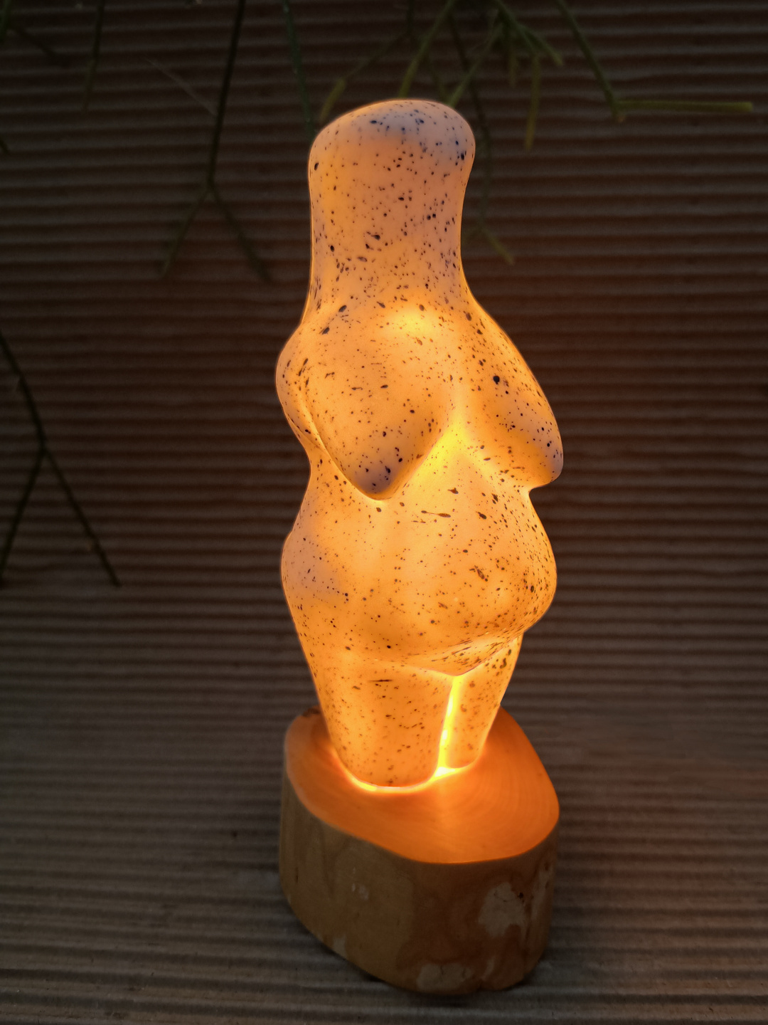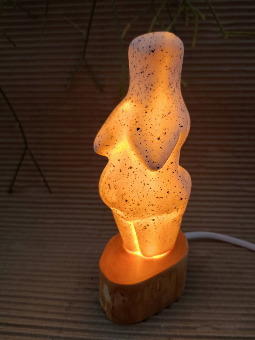 Pieza realizada con molde en porcelana, 1270°C. Tallada. Biscuit. Base de madera y bombilla LED
