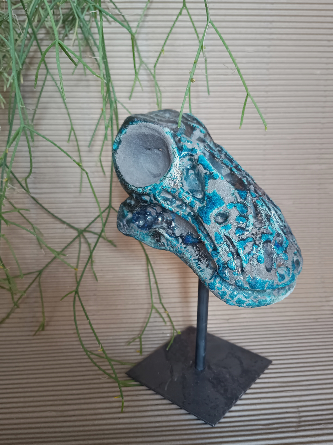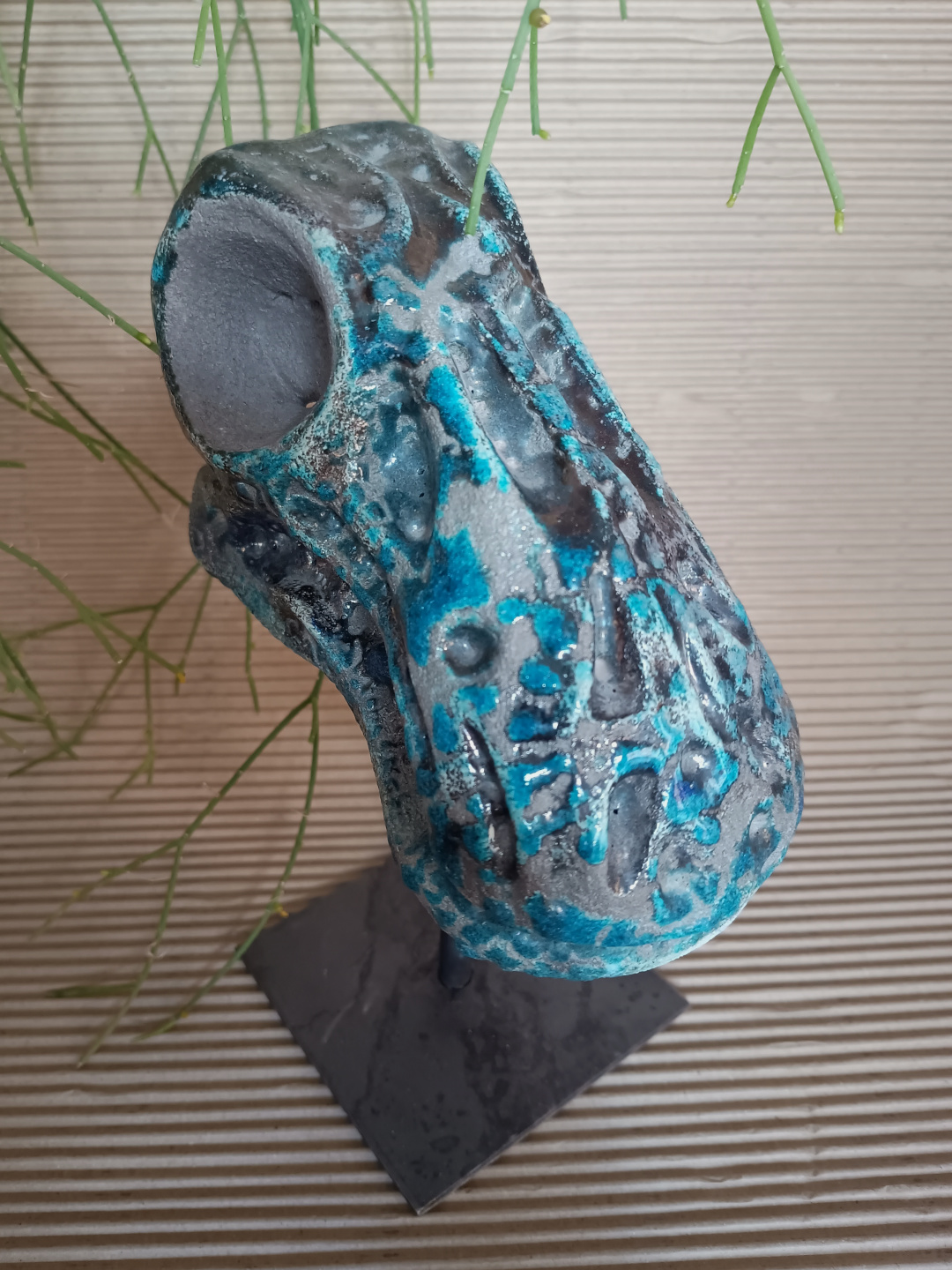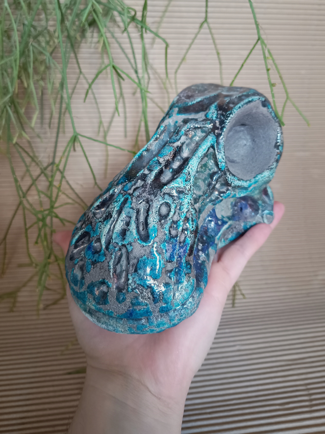 Pieza realizada a mano en arcilla blanca refractaria, 1250°C. Decoración en cocción especial RAKU