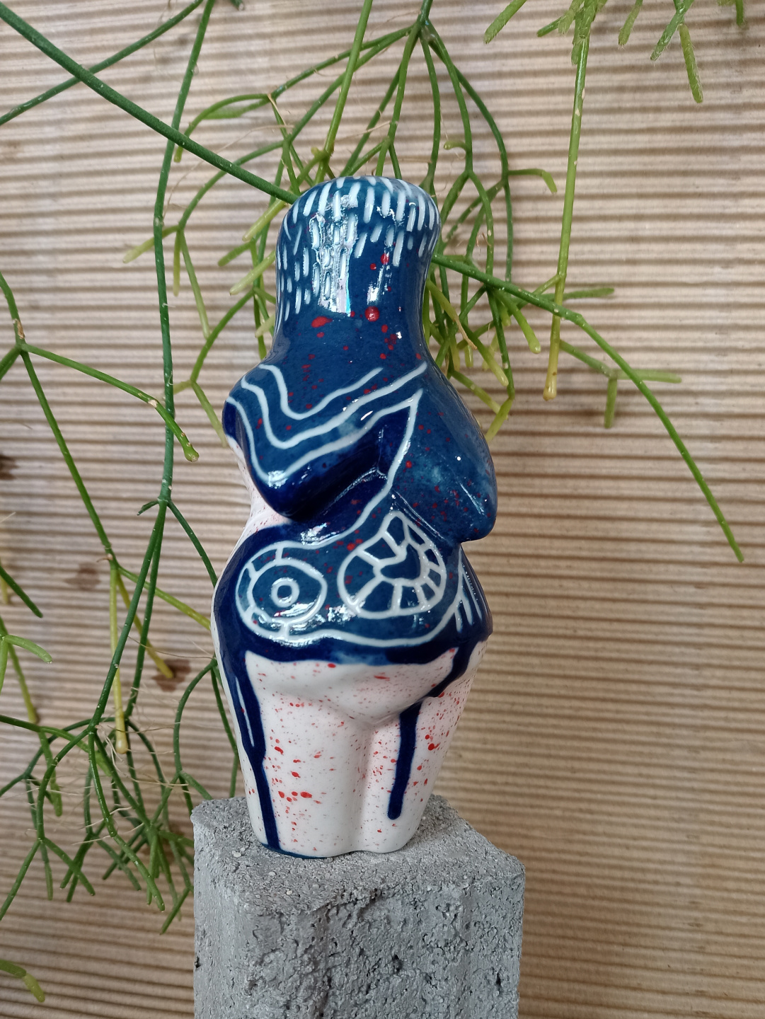 Pieza realizada con molde en porcelana, 1270°C. Tallada. Decorada con engobes. Esmalte y biscuit