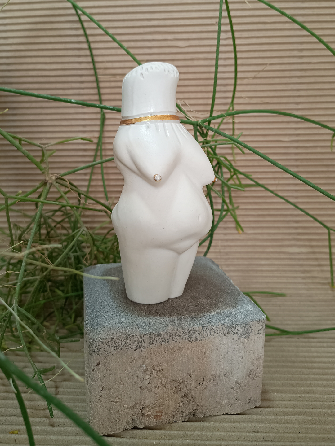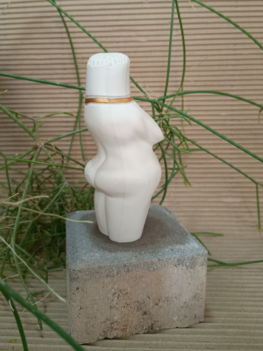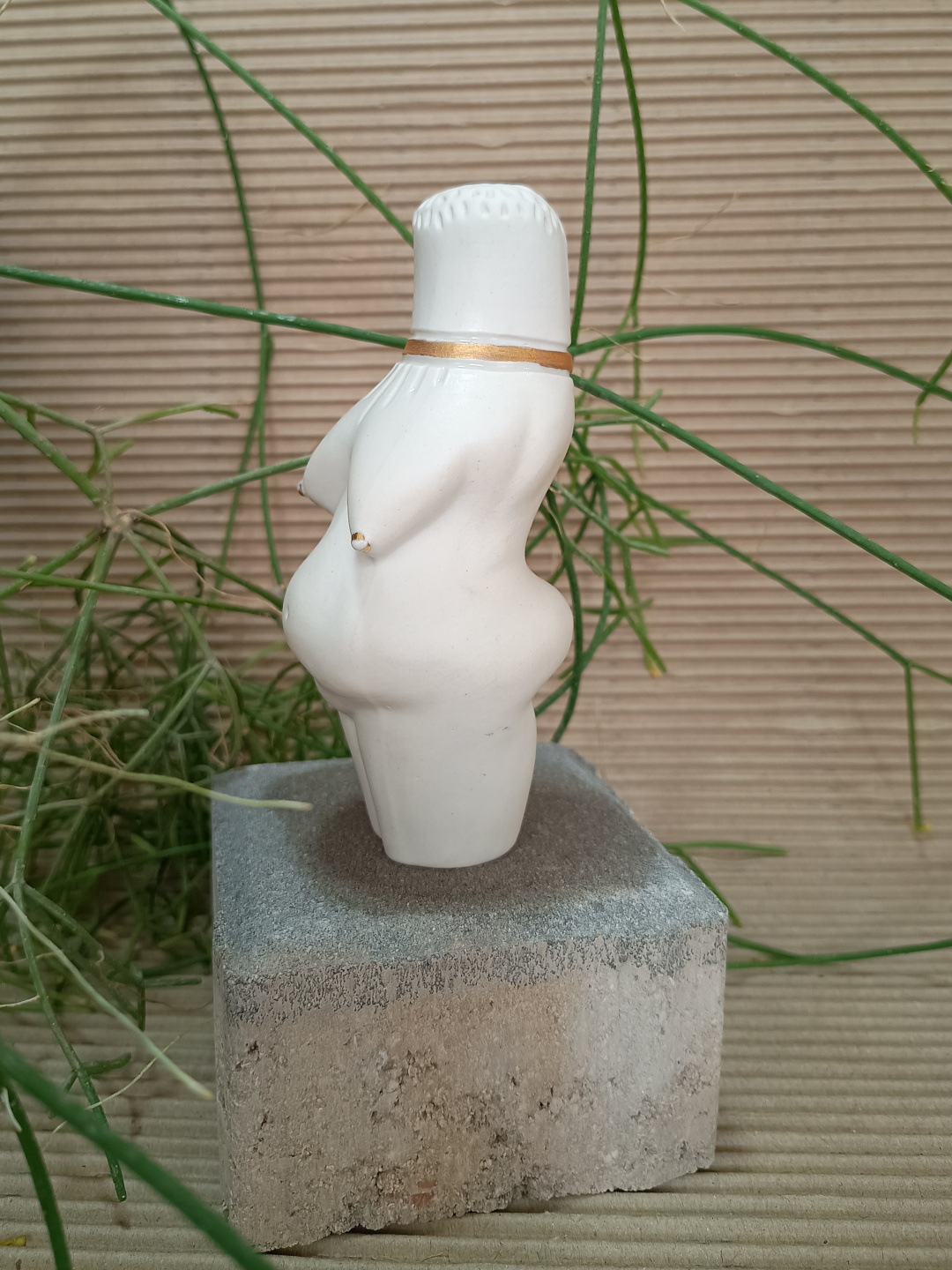 Pieza realizada con molde en porcelana, 1270°C. Decorada con lustre y biscuit