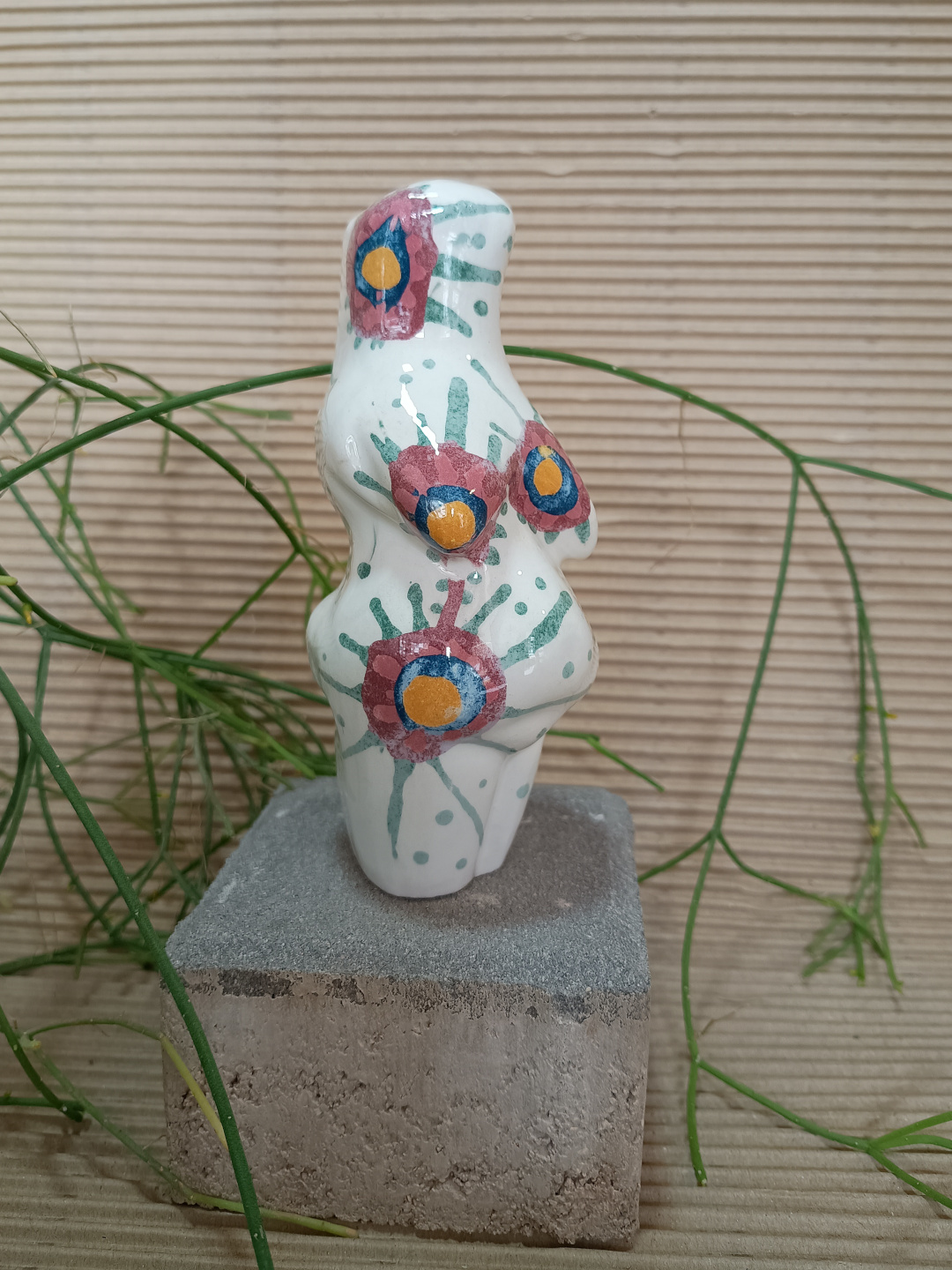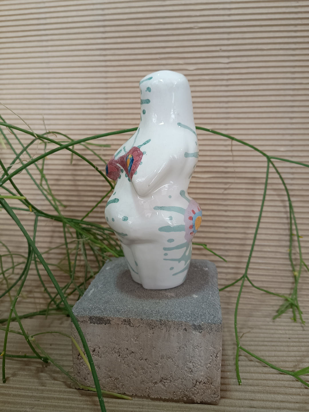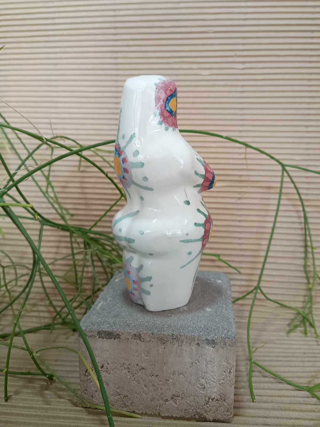 Pieza realizada con molde en loza blanca, 1050°C. Decorada con engobes y esmaltada