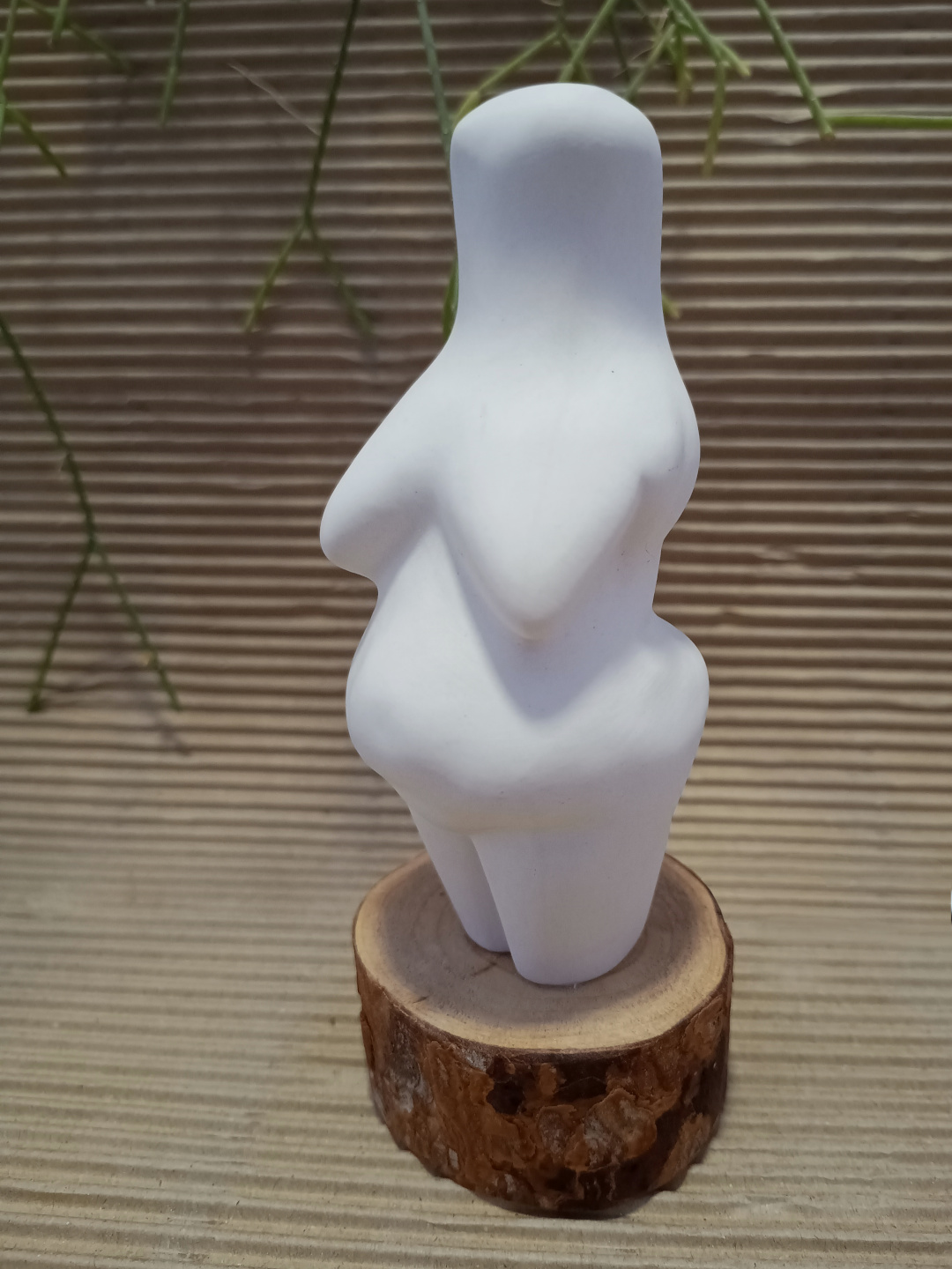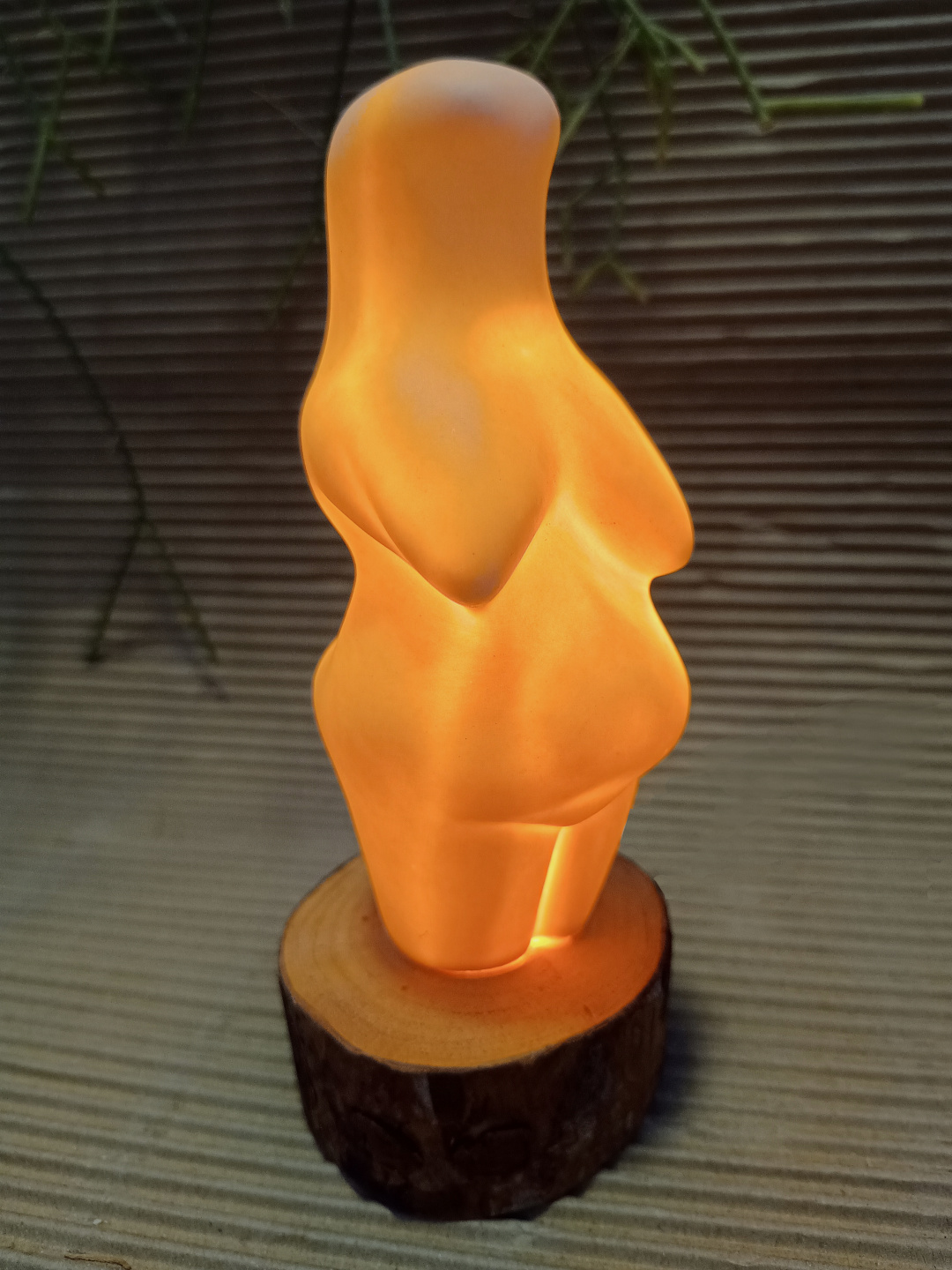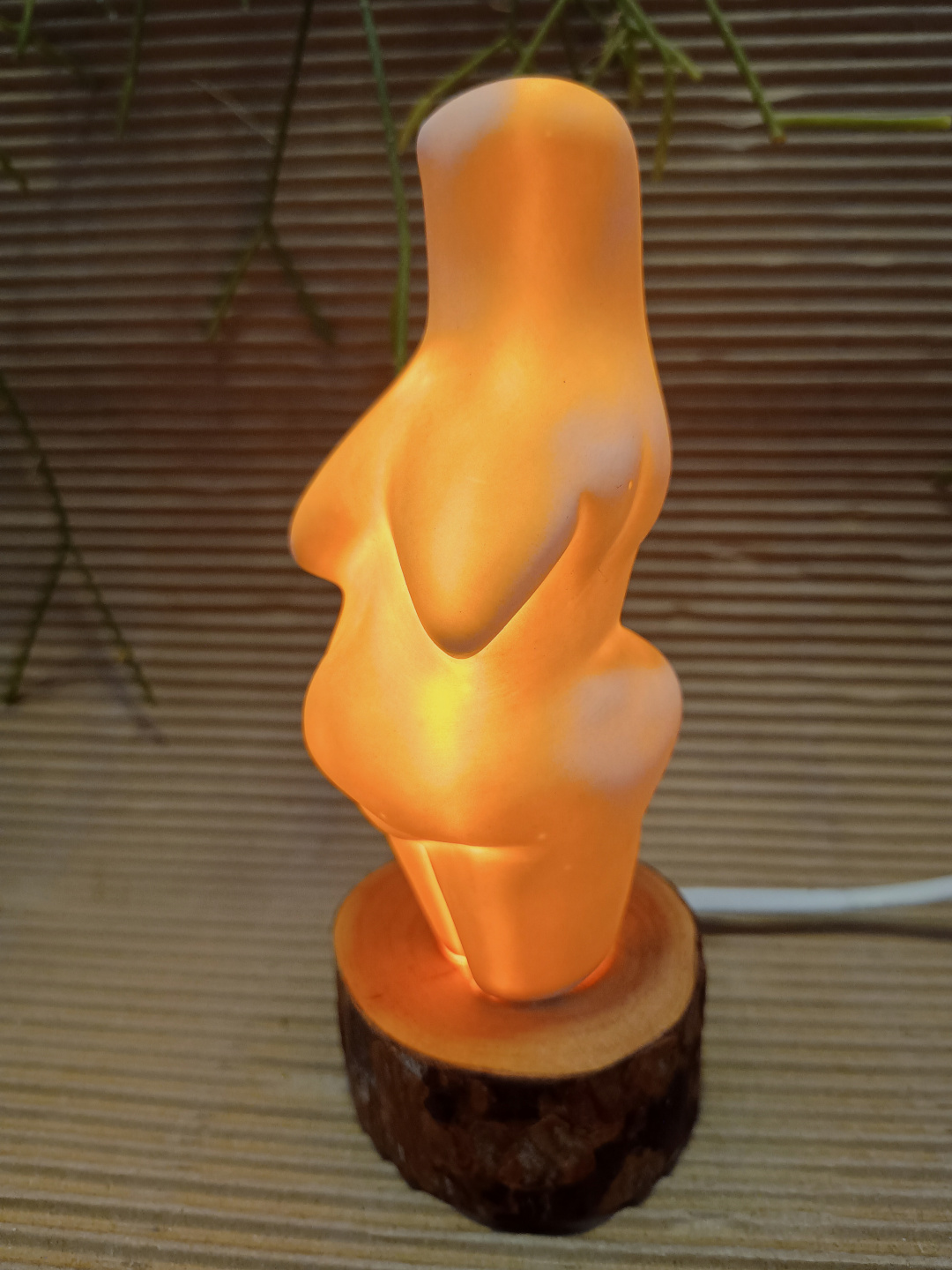 Pieza realizada con molde en porcelana, 1270°C. Tallada. Biscuit. Base de madera y bombilla LED